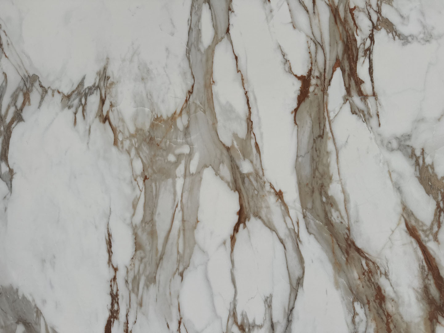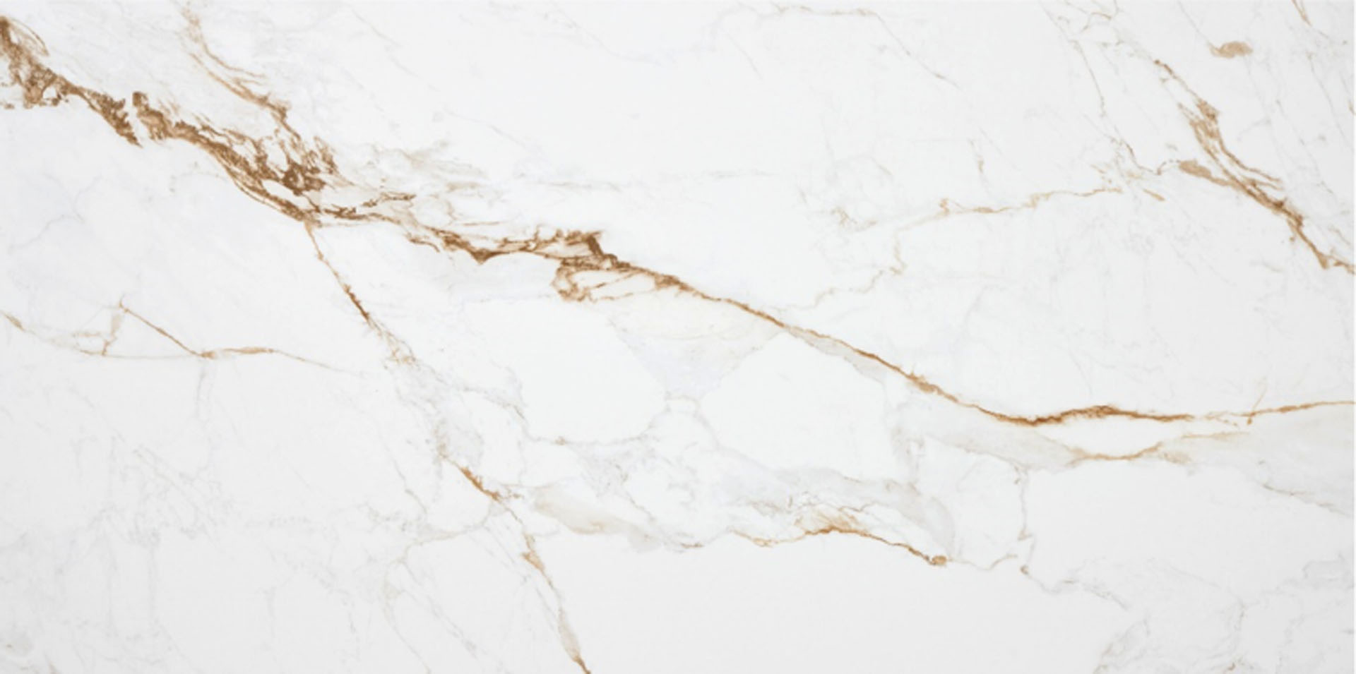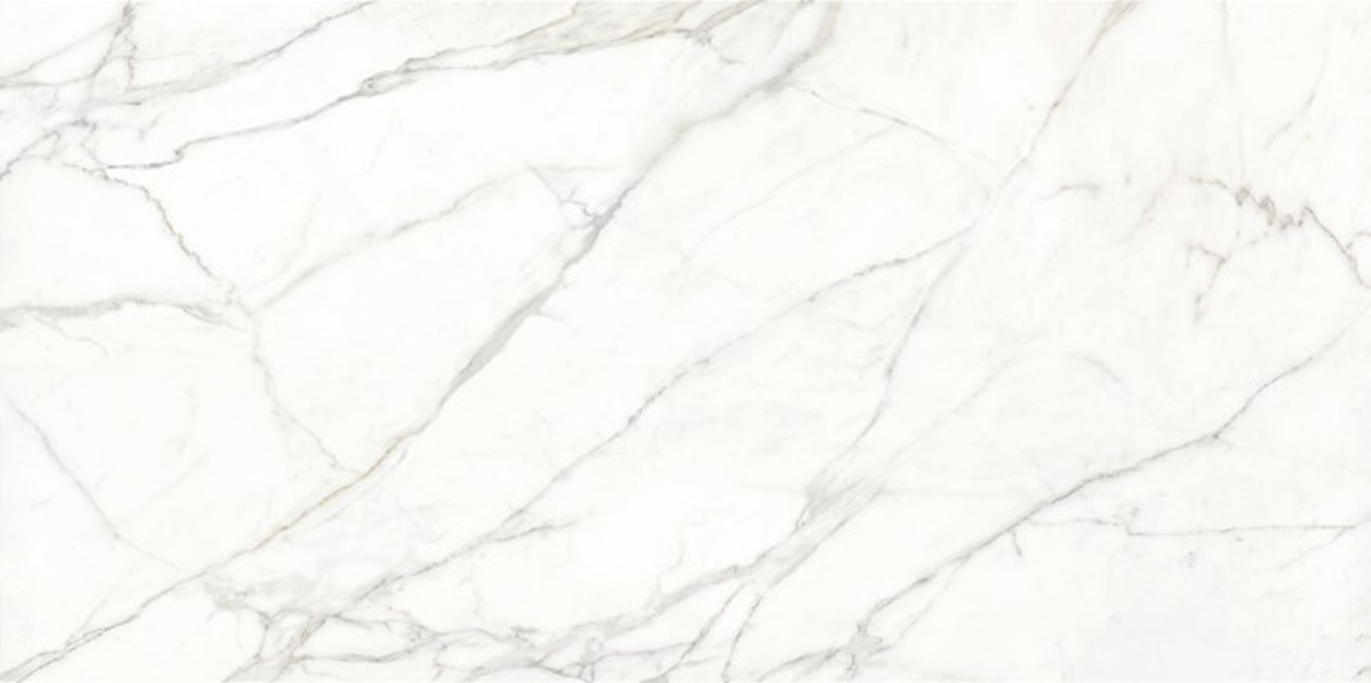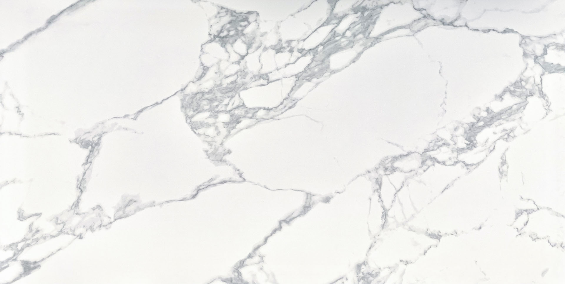 Superficie que presenta un fondo blanco, con vetas grises que varían desde delicadas líneas sutiles hasta patrones más definidos y expresivos. Su superficie lisa y mate refleja una sofisticación minimalista como la del mármol Calacatta.