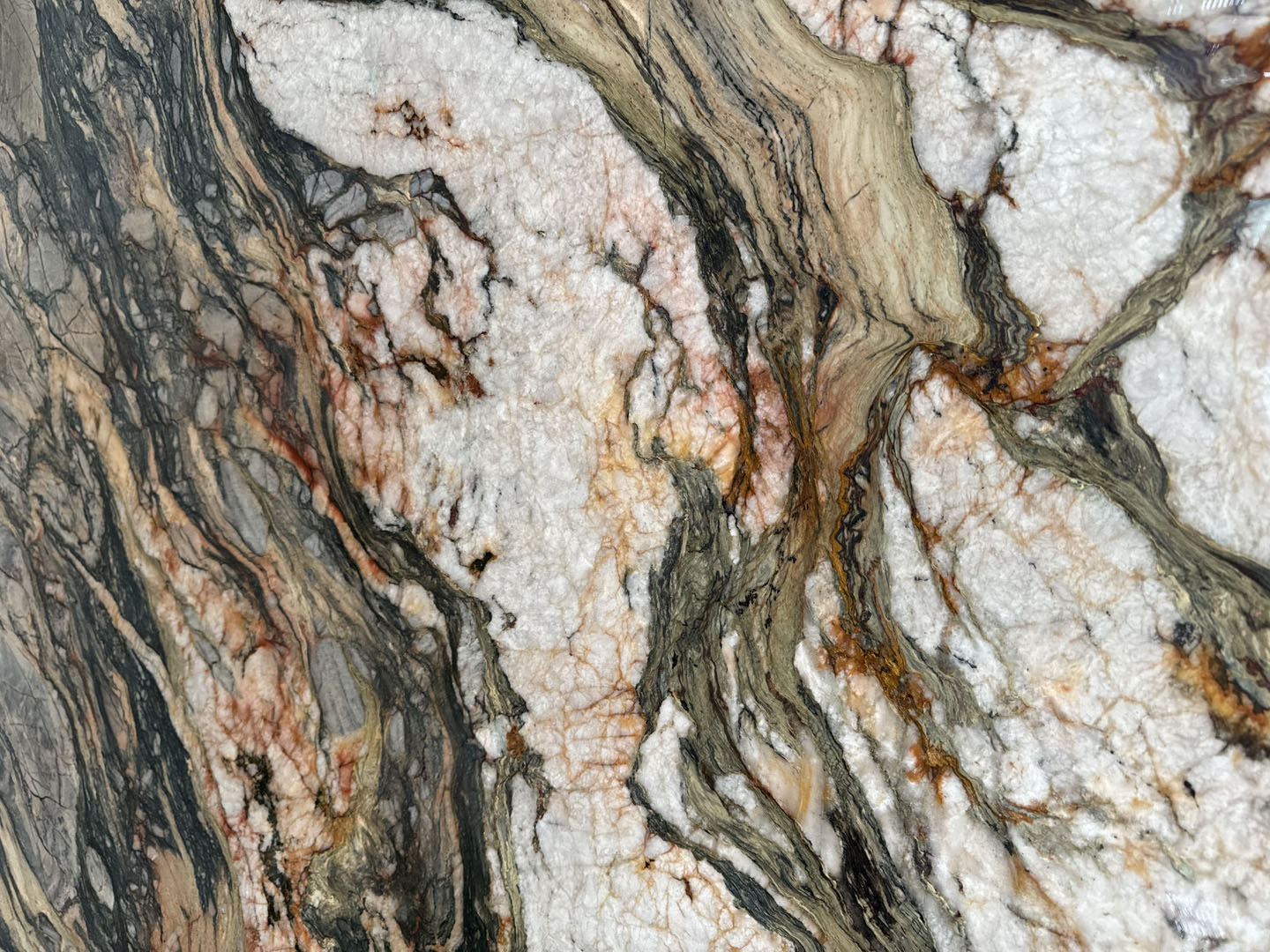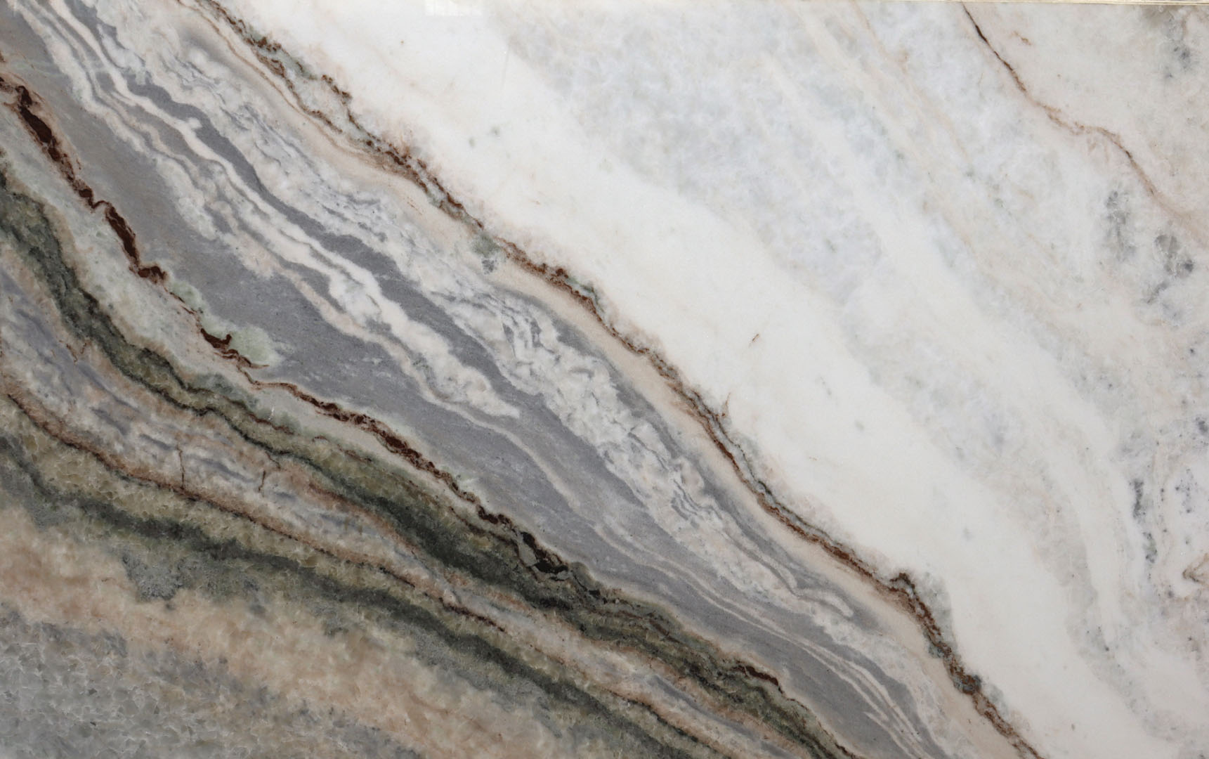 Mármol de gran belleza. Su fondo blanco con vetas rosadas, verdes, grises, café y cremas, le aportan movimiento y geometrías espectaculares cuando están en libro abierto.