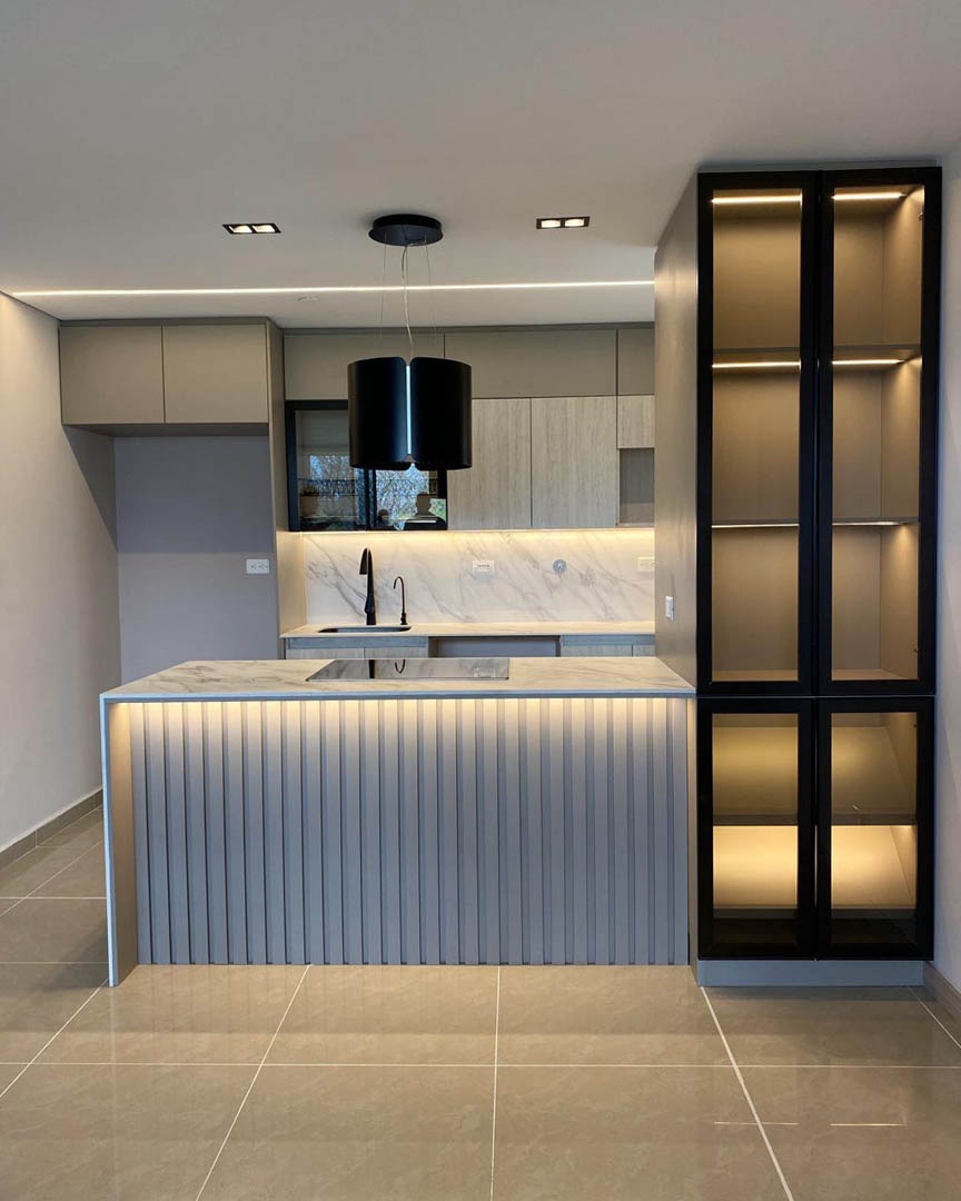En esta cocina el Cretta Atenea White carga el espacio con sus abundantes vetas grises. Un favorito para los que quieren una cocina impactante.